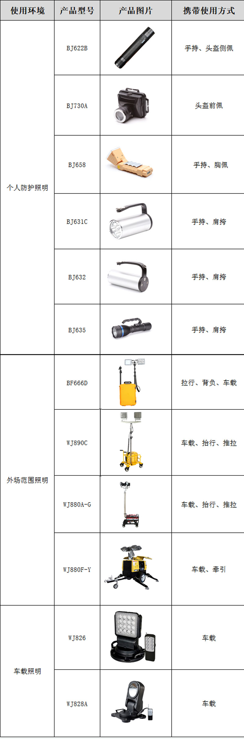 BF666D(FW6108)/WJ890C(SFW6121)/WJ880A-G(SFW6110B、GAD506A)等便捷式移動(dòng)式多功能照明裝置。拉桿箱式設(shè)計(jì),可手提、拉動(dòng),即使在崎嶇坎坷的地方也可以方便攜帶,整體燈具裝卸快捷方便,可以快速展開中小范圍的救援照明使用。